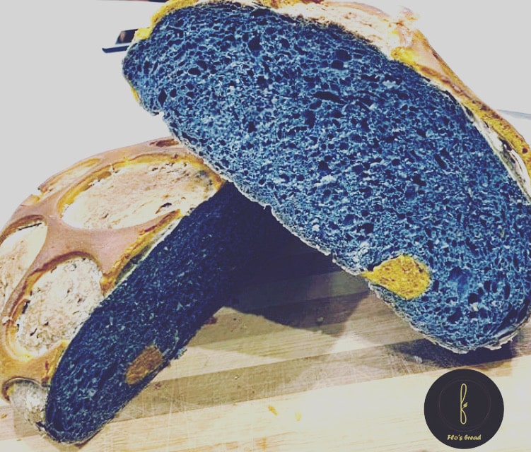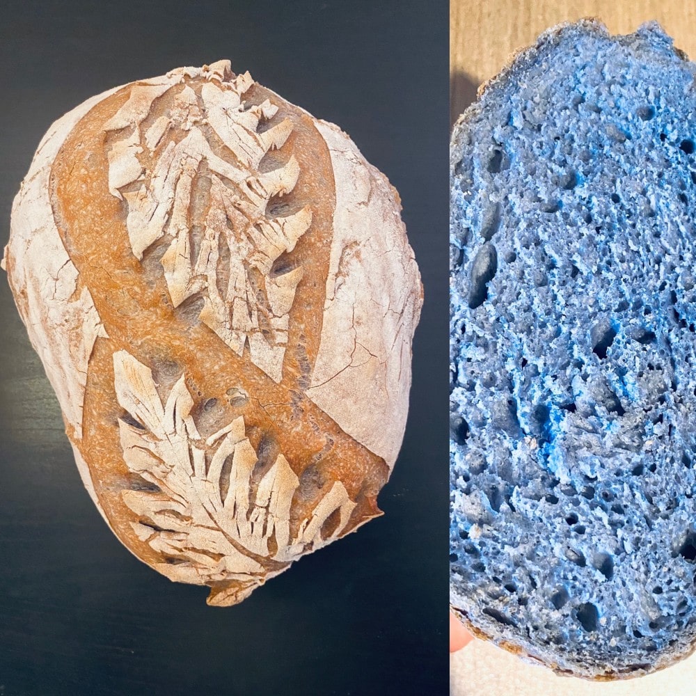 Cea facută doar din făină albă, semințe și infuzie de ceai „butterfly pea”, care-i dă o culoare aparte.