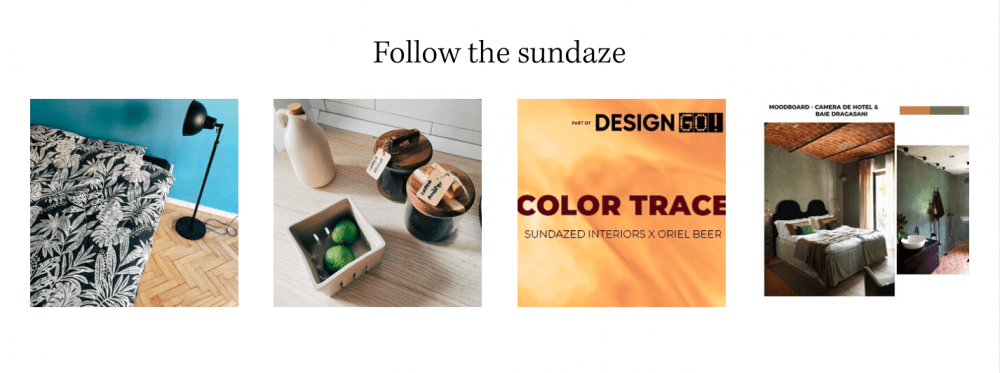Sundazed Interiors este un studio de Design fresh și entuziast cu idei și soluții care te vor ajuta în a concepe spațiul tău unic plin de energie pozitiva. Proaspăt lansat, studioul este ambițios și dorește să aducă culoare, bun gust și idei creative interioarelor, fie că este vorba de un proiect rezidențial, un eveniment, o ședință foto sau o simpla consultație de design.