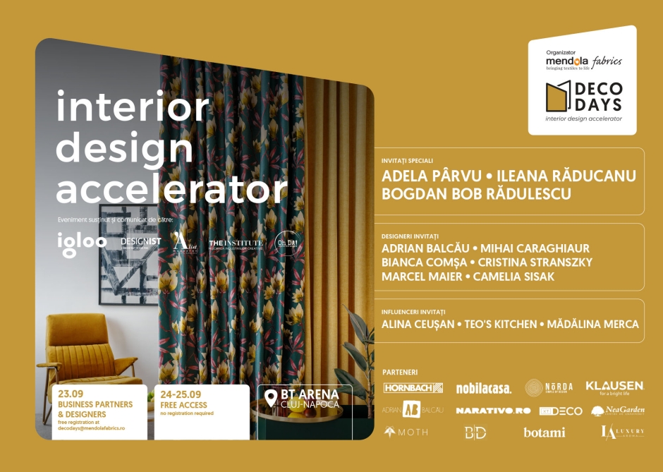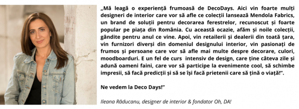 În spatele acestui eveniment se află prietenii noștri de la Mendola Fabrics, un brand 100% românesc, care poartă deja o istorie de peste 27 ani de design și business în această industrie, iar scopul lor este să asigure o coeziune în piața de business și cea a publicului final. Tocmai de aceea, acum, la cea de-a 6-a ediție, Deco Days devine un eveniment deschis publicului larg, dedicat iubitorilor de design interior.